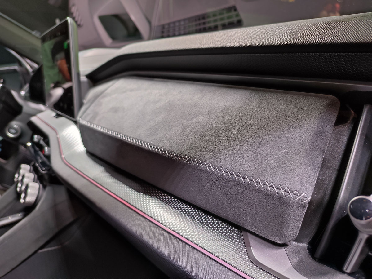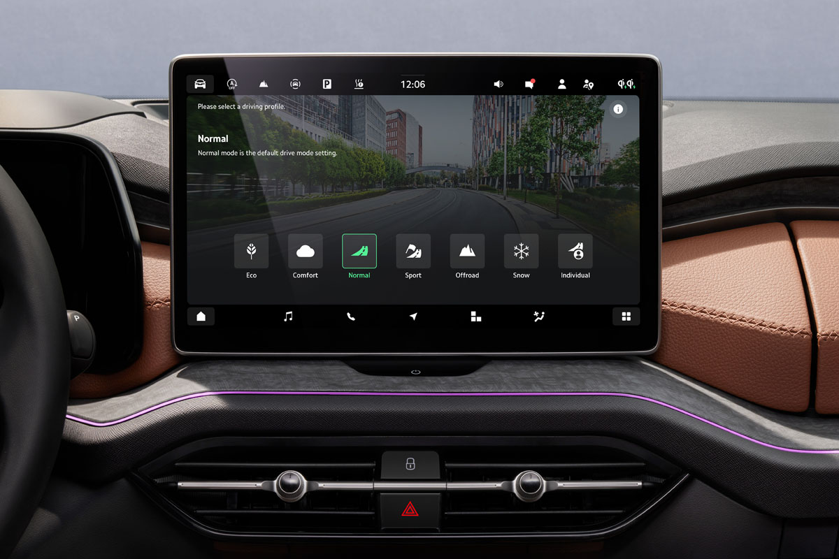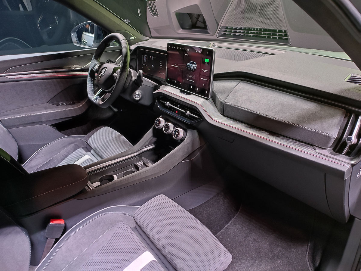 I do sada je Kodiaq bio vrlo luksuzan u najvišim paketima opreme, a sada je sve na još višem nivou. Istim materijalom kao na sedištima presvučena je i komandna tabla, ali i centralna konzola između sedišta, što nije baš uobičajeno u klasi. Izloženi primerci imali su eko-kožu boje konjaka i sivu alkantaru. U oči odmah upada krupan štep na rukohvatima u vratima i na komandnoj tabli, koji je jednako upadljiv na obe varijante materijala. Za ljubitelje naprednih tehničkih rešenja, treba reći da Kodiaq ima sve najnovije tehničke standarde VW grupacije. Zapravo, prvi je dobio potpuno nov koncept centralnog displeja. Samostojeći je, dijagonale do 13 inča.