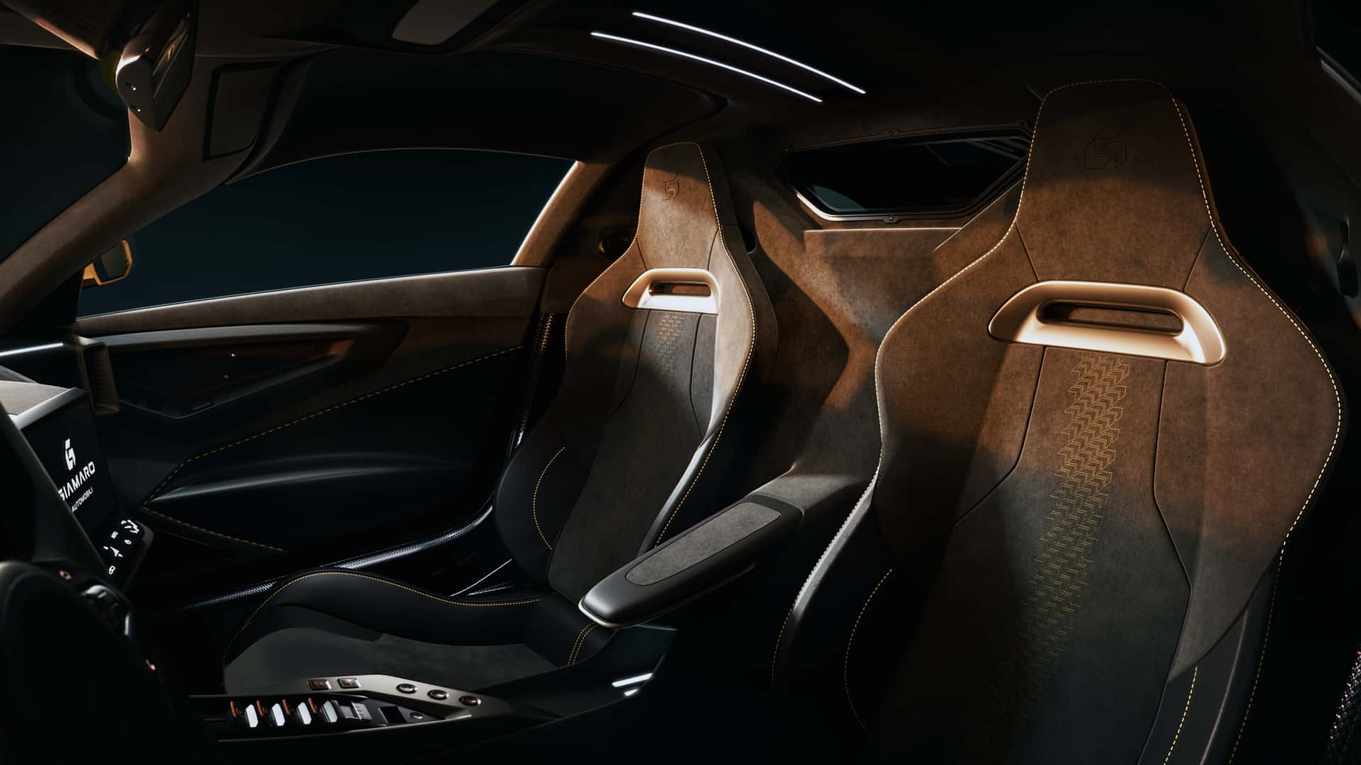 Volan je takođe bez nepotrebnih dugmića, dok su sedišta izrađena po meri, integrisana u šasiju i mehanički podesiva.