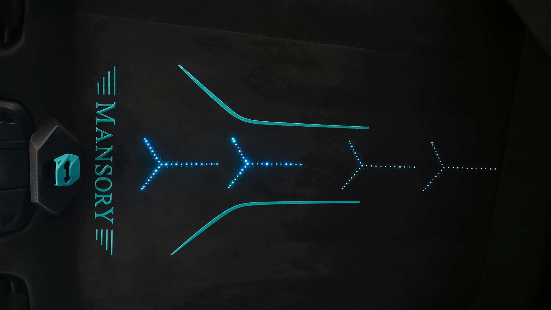 Enterijer je u potpunosti presvučen tamnim alkantarom, uz kontraste u tirkiznoj boji. Osvetljene obloge vrata i iluminirani Mansory logotipi daju diskretne akcente i naglašavaju zanatsku preciznost do najsitnijih detalja.