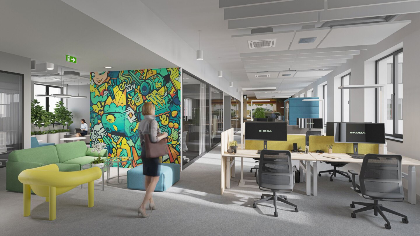 S Laurin & Klement Kampusom, češki proizvođač automobila predstavlja savremene koncepte New Work kancelarijskog prostora, prilagođene zahtevima moderne radne snage. Kampus je podeljen u različite zone, od kojih je svaka dizajnirana za širok spektar potreba i aktivnosti i podržana je vrhunskom tehnologijom. Ključni aspekt ovog modernog radnog okruženja je deljenje radnih stolova na preko 22.800 m² kancelarijskog prostora, što zaposlenima omogućava korišćenje fleksibilnih radnih prostora u svojim područjima.