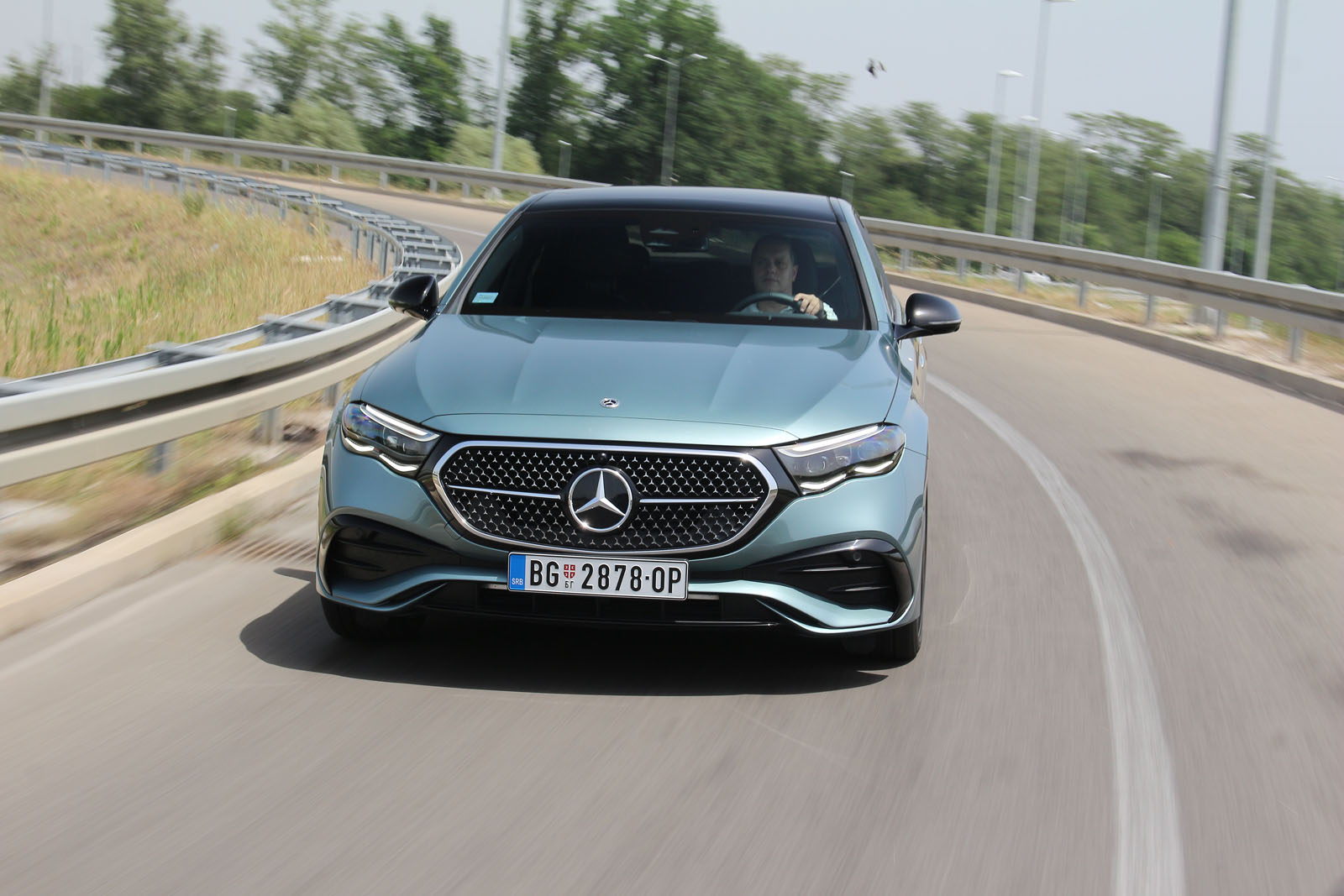Pod ogromnom haubom nove „E-klase“ na našem testu se našao dobro poznati četvorocilindrični dizel agregat zapremine 1993 ccm, sa „blagom“ hibridnom tehnologijom. To u prevodu znači da motor koji već sam ima 197 KS i izuzetan obrtni moment od 440 Nm raspoloživih u rasponu od 1800 do 2800 o/min, sada ima i starter-generator i novu bateriju koji mu obezbeđuju dodatnih 17 kW (23 Nm), kao i obrtni moment od još 205 Nm! Sa ovolikom snagom na raspolaganju ova gotovo dve tone teška limuzina lako stiže do „stotke“ za nepunih osam sekundi!