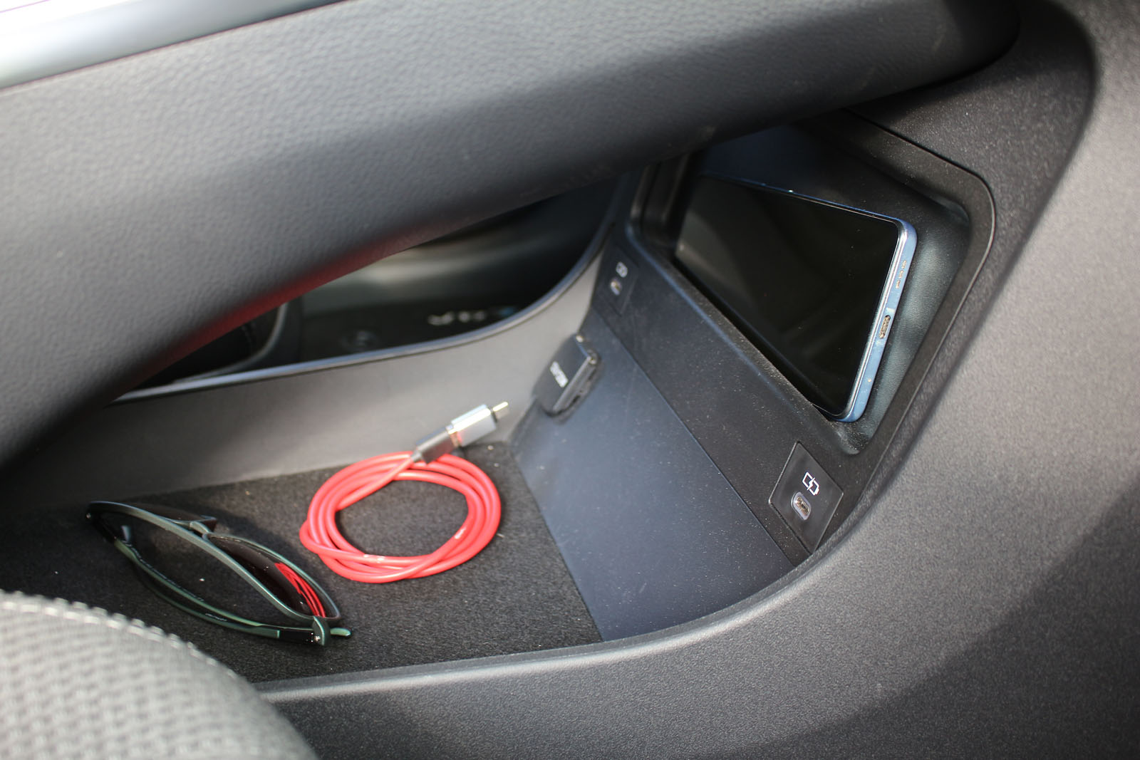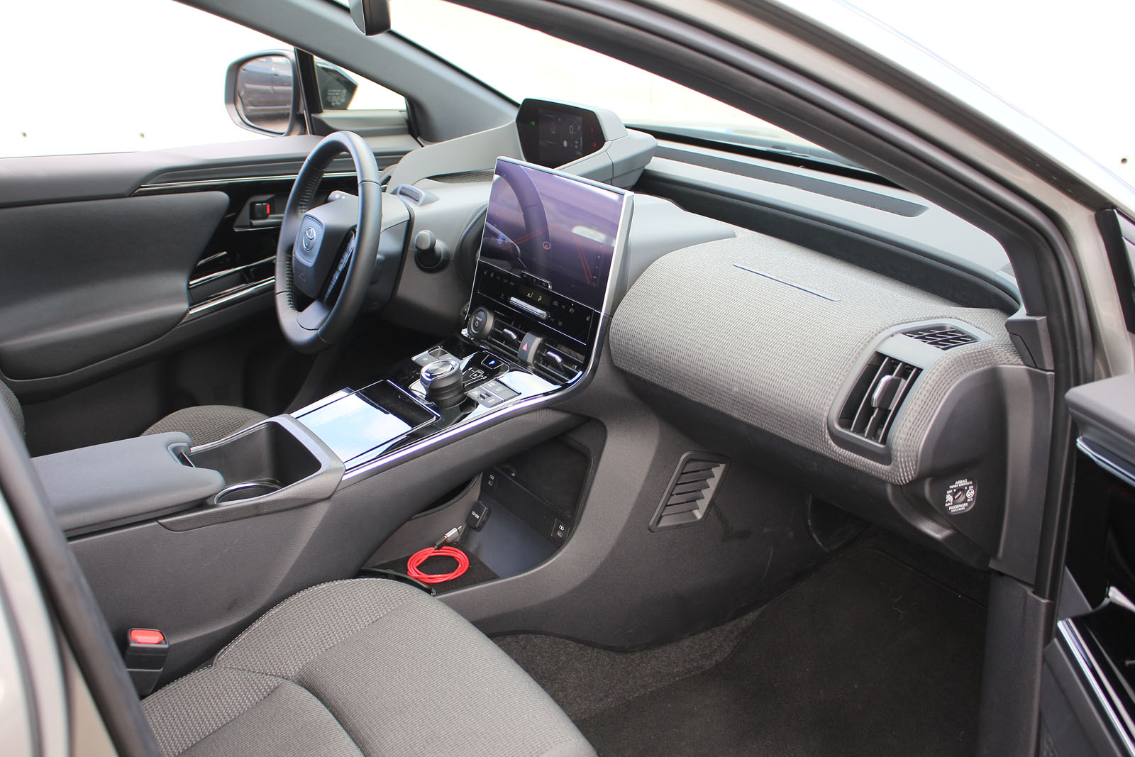 Toyota bZ4X može da se pohvali i zanimljivim materijalima. Platno na komandnoj tabli u automobilima uvek izgleda atraktivno, pogotovo ako ima neobično tkanje, kakvo je ovde primenjeno. Istim materijalom je presvučen i središnji deo sedišta, pa se može reći da je auto i u ovom pogledu prilično dizajnerski. Iznenadilo nas je to što ispred suvozača nema baš nikakve kasete, ali zato je tu dosta prostora u centralnom grebenu koji razdvaja prednja sedišta. Svuda su priključci USB tipa C, po dva napred i dva nazad, s tim da pregrada na vrhu za telefon ima i dodatni standardni USB. Jedino preko njega radi Android Auto povezivanje, dok Epl kar plej ima bežičnu mogućnost. Interesantan je i poluprovidan poklopac ove pregrade za telefon, kao jedan od mnogih detalja koji bZ4X čine neobičnim.